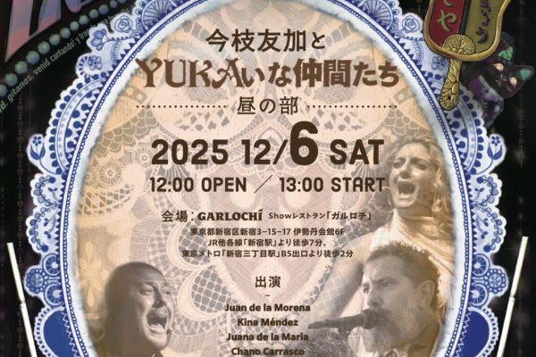 Yuka×El PerlaGuitar & Cante Special Liveフラメンコの真髄を奏でるギタリスト“エル・ペルラ”と、心震わすカンテで魅了する“今枝友加” そして、リズムに命を宿すパルマを奏でる“三枝雄輔”。ギターとカンテの深淵にたっぷりと浸るスペシャルライブをお届けします。三者が織りなす至高のひとときをどうぞお見逃しなく。◆日時:2025年11/7(金)12:00開場13:00開演◆場所:Show レストラン「ガルロチ」◆出演者:G.El Perla C.今枝友加 P.三枝雄輔◆料金:S席 7,500円 A席6,000円 学生・子供 4,000円 障がい者割引 3,000円(全席指定・1 drink付き)未就学児のお客様につきましては、膝上、ベビーカーの場合は無料にて、お席をご使用の場合は子供料金を頂戴いたします。◆ご予