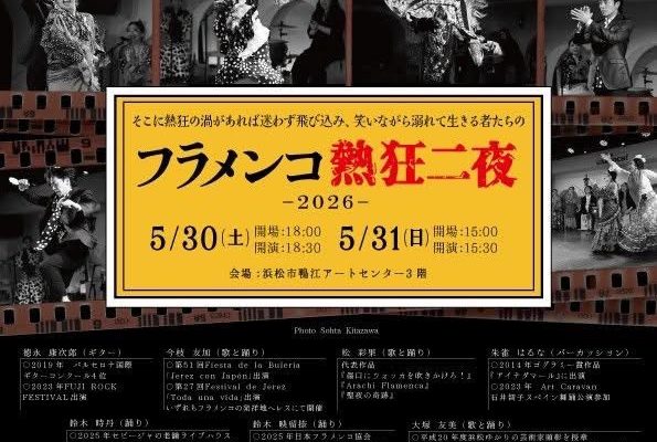 こちらのライブはおかげさまで、満席となりました。(現在キャンセル待ちを承っております)-そこに熱狂の渦があれば迷わず飛び込み、笑いながら溺れて生きる者たちの-「フラメンコ熱狂二夜」2026【日時】5/30(土)開場:18:00、開演:18:305/31(日)開場:15:00、開演:15:30【会場】浜松市鴨江アートセンター3階浜松市中央区鴨江町1番地<徒歩>浜松駅から徒歩15分<バス> 浜松駅バスターミナル3番乗り場から約10分【出演】ギター 徳永康次郎歌と踊り 今枝友加、松彩果、大塚友美踊り 鈴木時丹、鈴木映留捺パーカッション 朱雀はるな【チケット】前売6,500円/当日7,000円各日100席限定。申し込み受付順にお席をご用意いたします。